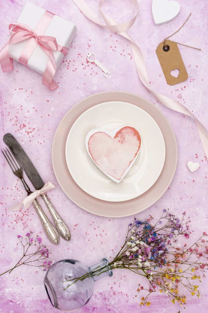 Drape a tablecloth in a romantic shade, add a few taper candles or small lanterns, and scatter fresh blooms or greenery down the centre of the table. Balloons or a small heart-shaped feature can add charm, but less is more. Soft lighting is key – dim the overhead lights and let candles or fairy lights do the talking.
