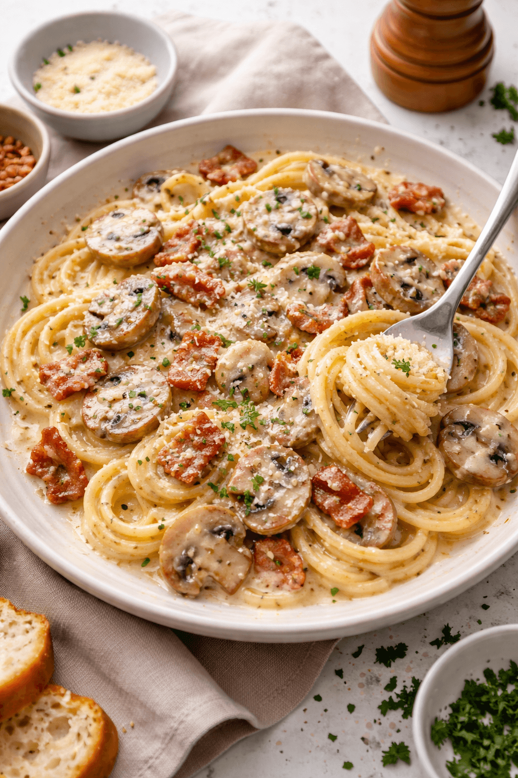Creamy mushroom and bacon spaghetti